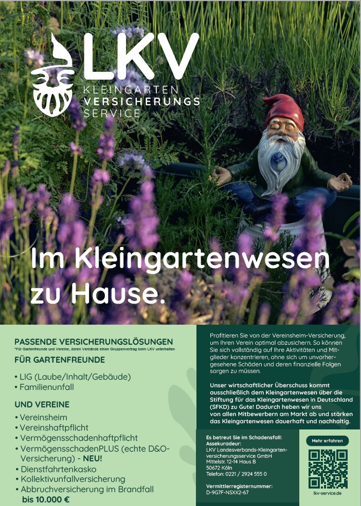 Zum 01.01.2025 hat der Landesverband Rheinland der Gartenfreunde e. V. maßgeschneiderte Gemeinschaftsverträge, unter anderem zur Unfall-, Haftpflicht- und Laubenversicherung mit der Janitos Versicherung AG, vertreten durch den LKV Landesverbands-Kleingartenversicherungsservice, abgeschlossen. Diese umfassen die gleichen Leistungen und Konditionen, wie dies bislang der Fall war. Jedes Mitglied der Kleingärtnerorganisation kann sich an den Gemeinschaftsverträgen beteiligen. Die Anmeldung zur Versicherung erfolgt über den Vereinsvorstand. Über Einzelheiten zum Versicherungsschutz informiert der Landesverband regelmäßig durch Rundschreiben, Merkblätter und Veröffentlichungen auf der Homepage.